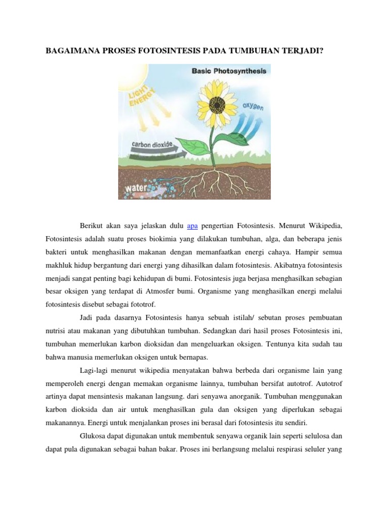 TEMA 2 | Winda Ratna Sari from sains.me Fotosintesis adalah proses pembuatan energi atau zat makanan/glukosa yang berlangsung atas peran cahaya matahari (photo = cahaya, synthesis = proses pembuatan/pengolahan). Bagaimana proses terjadinya fotosintesis pada tumbuhan? Fotosintesis adalah suatu proses biokimia pembentukan zat makanan/energi yaitu glukosa. Setelah sebelumnya kita mempelajari dan membahas tentang sejarah ditemukannya fotosintesis pada postingan sebelumnya. Terjadinya proses fotosintesis yang mengubah energi cahaya menjadi energi kimia dan nantinya akan menghasilkan o2 sebagai produk sudah jelas bahwa cahaya merupakan bahan utama dalam proses. Fotosintesis adalah proses pembuatan makanan yang dilakukan tumbuhan berdaun hijau yaitu klorofil. Fotosintesis artinya proses penyusunan senyawa yang sederhana menjadi senyawa yang kompleks, pada bagian tumbuhan yang mengandung klorofil, dan dengan bantuan cahaya matahari. Fotosintesis adalah proses pemanfaatan energi cahaya sebagai energi kimia dalam molekul organik 2.